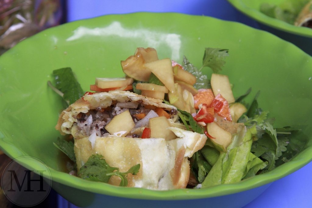 Næste stop på turen lå på et hjørne midt mellem markedsboderne. Endnu engang blev vi bænket på små skamler og fik serveret et måltid, der stadig står for os som noget af det bedste fik fik på hele turen. Vi fik små fyldte rispandekager, der var stegt og så med en sauce og friske krydderurter til. Det var en smagseksplosion af de store og med både blødt, sprødt, friskt og spicy. Hold nu op, det var lækkert! Tænk engang, at man kan trylle SÅ meget på et gadehjørne!
